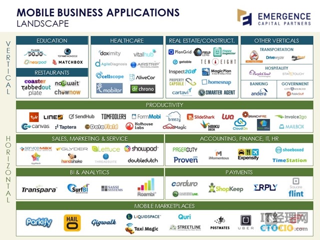 在水平应用领域,效率、营销/服务、财务、IT、人力资源、商业智能/数据分析、支付、移动电子市场等也都涌现了大量的创业公司和产品。这个领域的大多数创业公司聚焦在三个领域:效率、移动市场和营销客服。效率方面的创业公司主要特点是专注于电子邮件、桌面和日程的移动整合。例如Tylr Mobile最近发布了一款面向销售的应用——Workinbox,将Salesforce.com的数据与电子邮件联系起来。Cloudmagic开发的移动搜索产品则可以让用户同时搜索多个云服务中的文档(例如邮件、日程、Box云存储、印象笔记等)