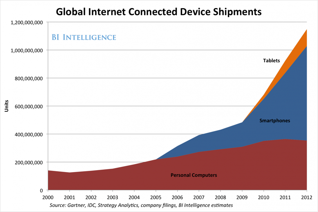 从下面这张全球联网设备的发货数据图表我们可以很直观地看到,2005年是一个分水岭,这一年PC占据着全部上网设备的市场份额,之后智能手机和平板电脑开始起始,在2011年超过了PC市场份额,并不断拉大差距。