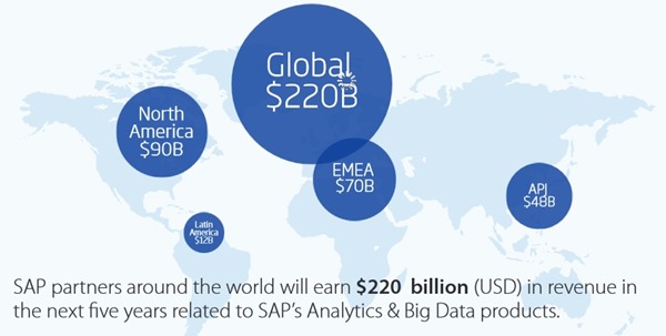 IDC最近公布的一张信息图显示,未来五年SAP全球大数据与分析方案合作伙伴的收入将高达2200亿美元。