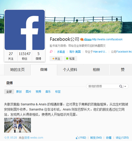 9月7日,认证为新浪微博工作人员的@曹增辉证实,Facebook已经在新浪开通其官方微博,微博名为@Facebook公司。虽然该账号并未取得新浪官方的机构蓝V认证,但据新浪微博官方人员曹增辉确认,Facebook开通微博的消息属实。