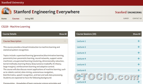 点评:虽然Andrew NG去了百度,但斯坦福大学在机器学习领域依然实力雄厚,这门课程包含了机器学习领域的基本概念,例如监督式和非监督式学习、强化学习和适应性控制等。此外这门课还涵盖了最新的一些机器学习主题,例如机器人控制、数据挖掘、自动导航、生物信息学、语音识别、文本和web数据处理等。学员要求有基本的计算机科学知识,能够编写可用的电脑程序,同时还要对概率论和线性代数有所了解。