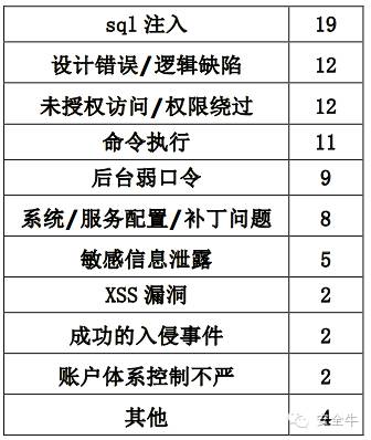 可以从漏洞分布图看出,sql注入与逻辑漏洞(设计错误/逻辑缺陷、未授权访问/权限绕过)还是占最多(50%)。