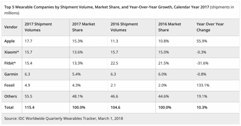 但是2017年剧情发生反转,苹果的Watch Series 3三代产品市场表现强劲,而Fitbit的产品在购物季表现疲软,苹果当季销售了800万只手表,而Fitbit只卖出540万只,小米的销售量也只有490万只。全年来看,苹果出货量达到1770万只,逆转领先小米的1570万只和Fitbit的1540万只(二者可以看作是并列第二):