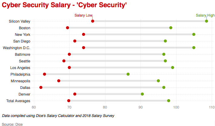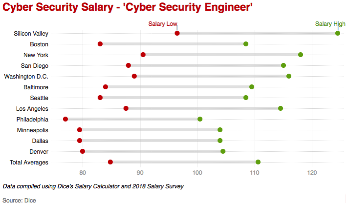 Dice重点调查了网络安全从业人员(Cyber Security)、网络安全工程师(Cyber Security Engineer)和网络安全分析师(Cyber Security Analyst)三个安全岗位,下图是三个安全岗位在不同城市的薪酬区间: