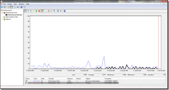 据悉,不仅仅Metro界面将整合SkyDrive的2G存储空间和桌面文件同步支持。Windows 8浏览器甚至微软Office办公套件都将通过微软的Notes集成SkyDrive。作为对苹果公司的反击,微软还表示甚至Windows 7和 Vista操作系统用户也能用上SkyDrive桌面程序,而且CPU占用率还很低:下图是用SkyDrive程序上传500M文件到云端的CPU占用率。