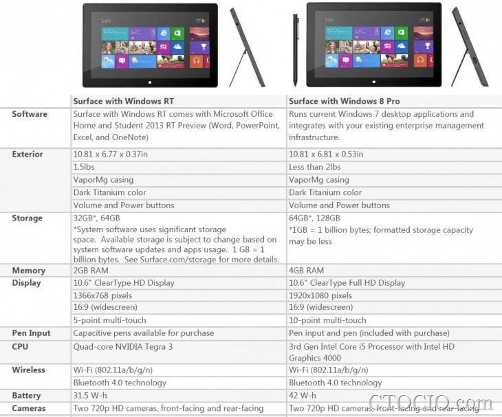 以下是Surface Pro和Surface RT的详细配置对比表(点击放大):