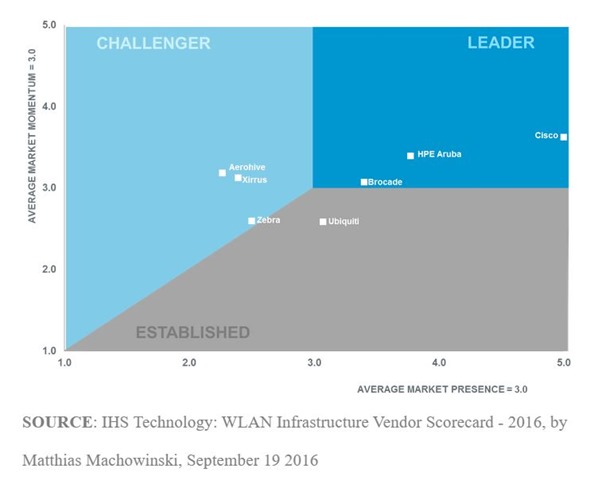 IHS表示:“由于市场整合,WLAN供应商市场分化为两个类型,一类是能够解决整个企业级网络需求的端到端网络供应商,另一类是专注于某个特定小型市场或用新办法解决老问题的专家。市场领导者——Brocade、思科和HPE Aruba——均为端到端网络供应商,他们充分利用其在业务组合和客户群的全面性优势,广泛地参与所有细分市场的竞争。”