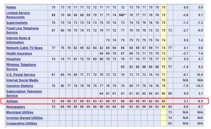 航空业客户满意度看上去还不错,比银行、服装、汽车行业排名高,但下表可以看出比酒店、餐饮和超市等行业的要低: