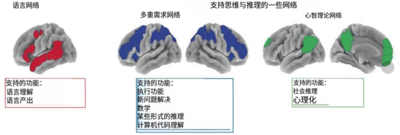 当我们处理语法和词汇时,大脑中一个特定的“语言网络”会被激活;但当我们解数学题、进行逻辑推理或解决复杂问题时,忙碌的却是另一个完全不同的区域——“多重需求网络”。而在揣摩他人意图、进行社交推理时,负责的又是“心智理论网络”。