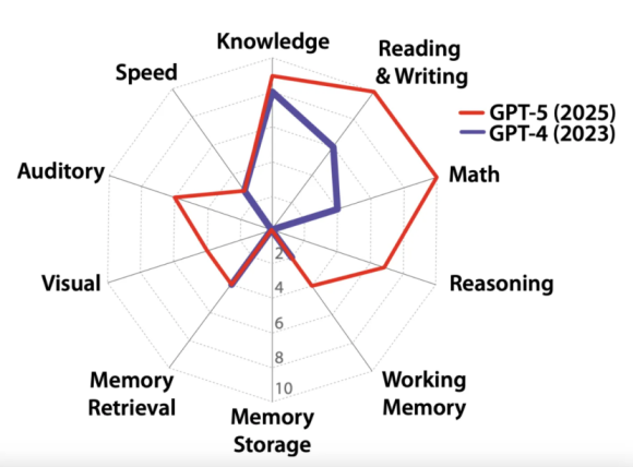 今年,一个由图灵奖得主 Yoshua Bengio 等大佬组成的小组,更是给“通用人工智能”列出了一张残酷的体检表。在这个包含知识、语言理解、推理、感知、记忆、规划等十个维度的“蜘蛛网指标”(下图)中,当前的主流模型虽然在“知识”和“语言”上得分惊人,但在长期记忆、稳健推理和真实世界感知上却严重“偏科”。