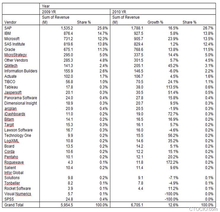 Gartner的报告还显示2009年以来商业智能的软件市场格局并未发生大的变化。SAP以22.9%的市场份额领跑(这要归功于2007年对Business One的收购),Oracle以15.6%的份额位居榜眼,SAS则以13.2%位列第三。值得注意的是,IBM虽然以11.6%的市场份额屈居第四,但是IBM最近已经将数据分析作为战略重心,收购一系列的公司包括Cognos、SPSS、ILog、CoreMetrics、Algorithmics、OpenPages、Clarity Systems、Emptoris、DemandTec等。